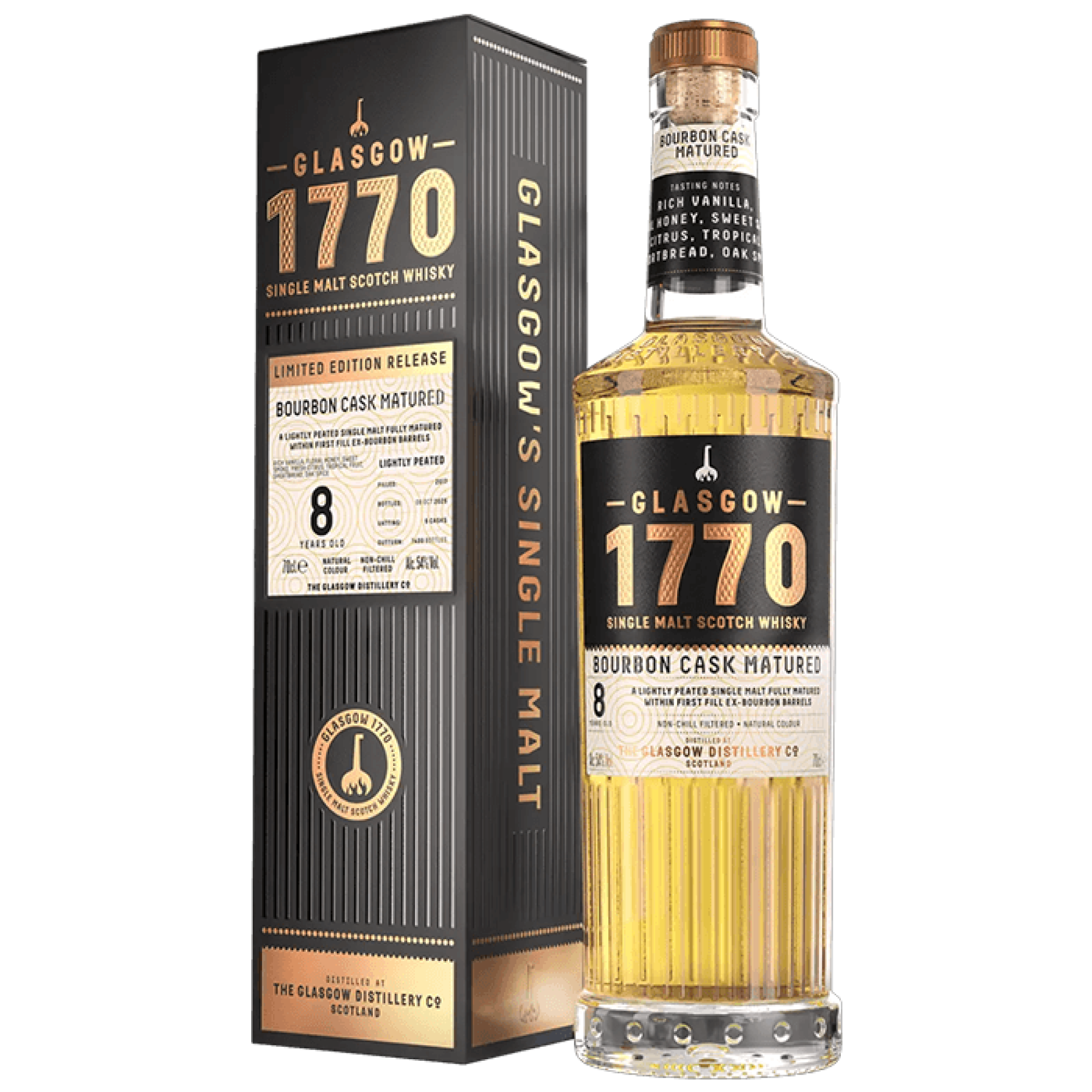Een nieuwe toevoeging aan het Glasgow 1770 Single Malt-assortiment: Bourbon Cask Matured. Een doorlopende botteling die gelijke delen van twee whiskyproductiestijlen die de Glasgow Distillery hanteert combineert: ongeturfde en geturfde single malt.